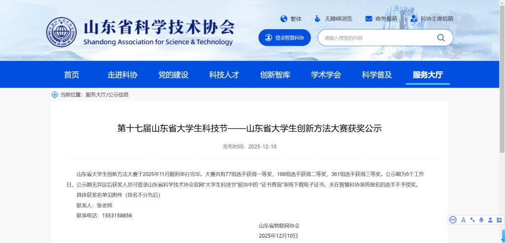 近日,第十七届山东省大学生科技节——山东省大学生创新方法大赛获奖名单正式公布。由我校马克思主义学院思政课教师周婧文、刘希娟共同指导,2025级药学系学生关慧琳、李响组成的参赛团队,凭借作品《算法巧织沂蒙谱,红魂新唱时代声》,在“AI+思政”创新创意竞赛赛道中荣获一等奖。