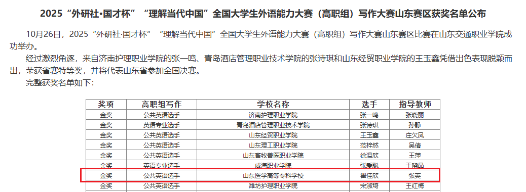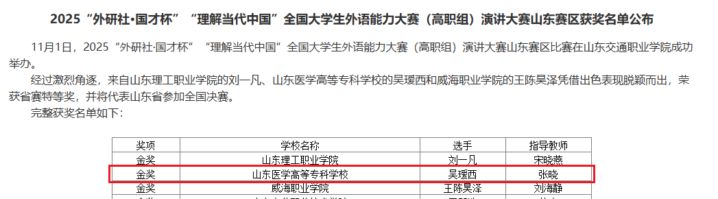近日,山东医学高等专科学校学子荣获2025“外研社·国才杯”“理解当代中国”全国大学生外语能力大赛山东省省赛2项金奖、2项铜奖、4项优胜奖。获得演讲比赛金奖的吴瑷西同学晋级全国决赛,这是我校在本项比赛中取得的最好成绩。